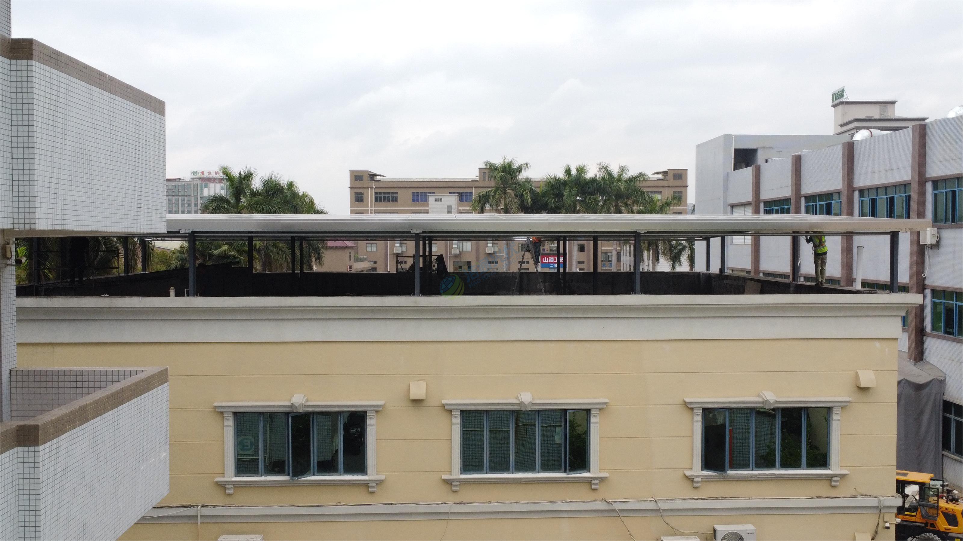 該項(xiàng)目位于東莞寮步,采用132塊555W晶科光伏板,200mmH鋼支架,所有立柱立于業(yè)主現(xiàn)有水泥柱上,整體結(jié)構(gòu)穩(wěn)定牢固。